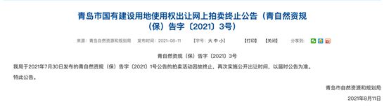 8月11日,青岛市自然资源和规划局发布公告称,7月30日青岛公示的第二批次集中出让的100宗地拍卖活动因故“终止”,再次实施公开出让时间,以届时公告为准。