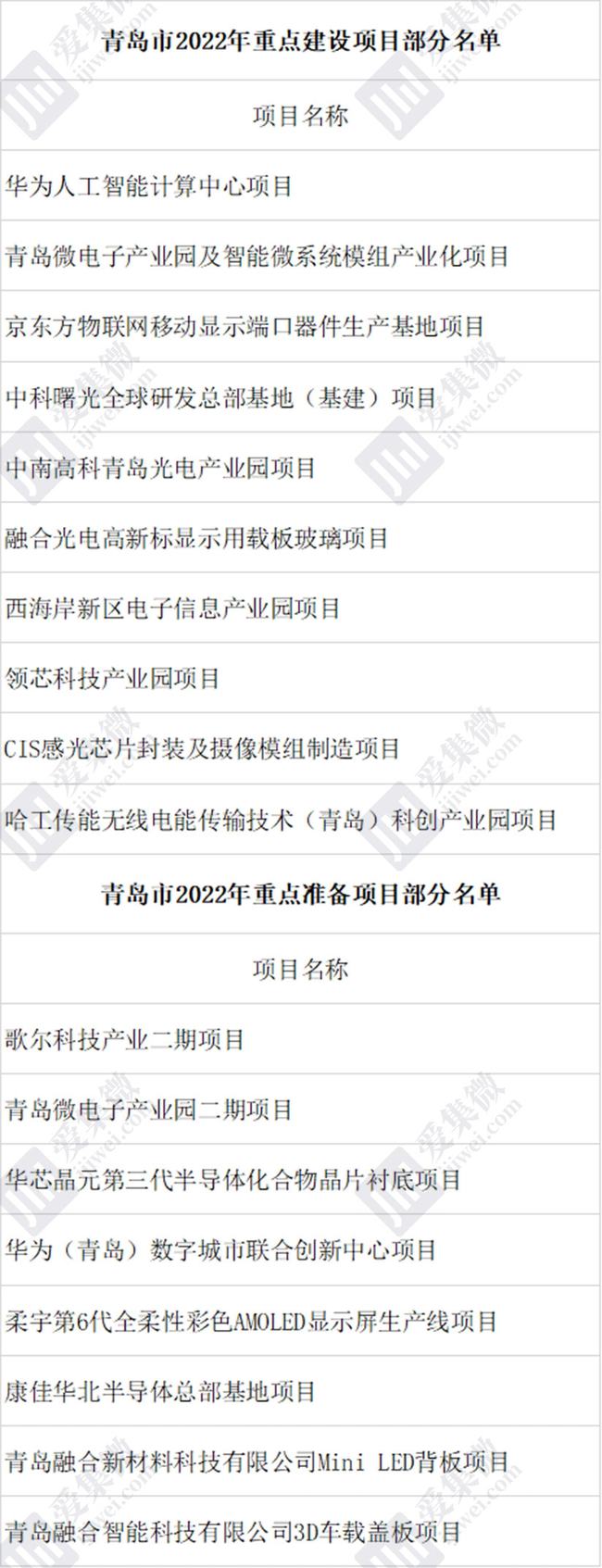 集微网消息,青岛发布消息显示,从青岛市发展改革委获悉,1月10日,2022年青岛市级重点项目经青岛市政府同意正式发布实施。